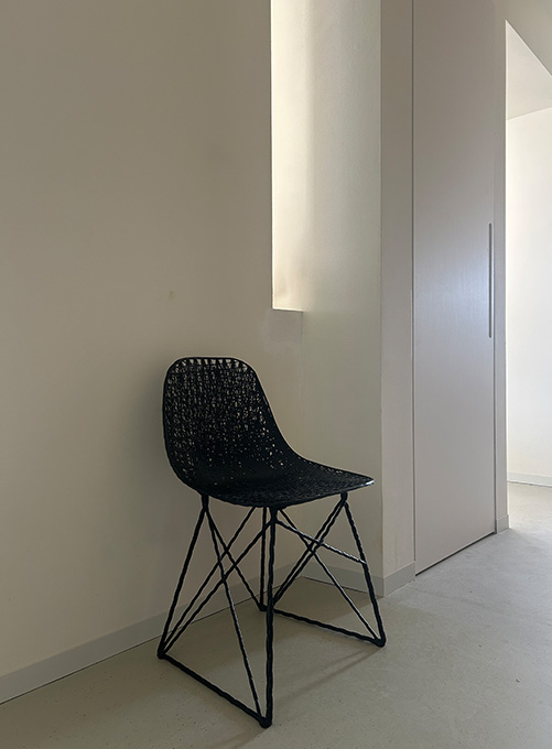 Het appartement is opnieuw ingedeeld als een vloeiende doorlopende ruimte. Met de grote schuifdeuren kunnen de kinderen zich gedeeltelijk of volledig afzonderen. In de dragende wand zijn 2 doorzichten gemaakt voor zicht op de voordeur extra contact.