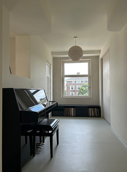 De opdrachtgevers wilden een licht 'loft achtig' appartement met voldoende (berg)ruimte en privacy voor 2 volwassen kinderen. En een plek om samen te koken en muziek te maken.