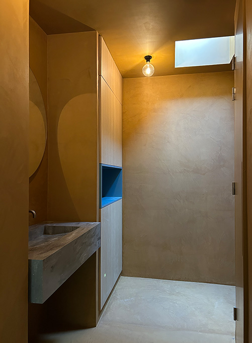 De trap is gespiegeld waardoor een ruime berging onder de trap gemaakt kon worden en een 'zee van licht' van boven naar beneden komt. De buitenwanden zijn voorzien van biobased isolatie met een leemstuc. Voor de hybride installaties (voorbereid op volledig gasloos) is een bergruimte toegevoegd. Dit leverde in de badkamer extra ruimte op en samen met een toegevoegd daklicht voelt de badkamer een stuk ruimer aan. De badkamers en toilet zijn afgewerkt met Mortex (materiaalbesparing) en ontworpen met slimme bergruimte. Het kleurenpallet is afgestemd op meeverhuisde elementen en geeft elke ruimte een eigen sfeer.