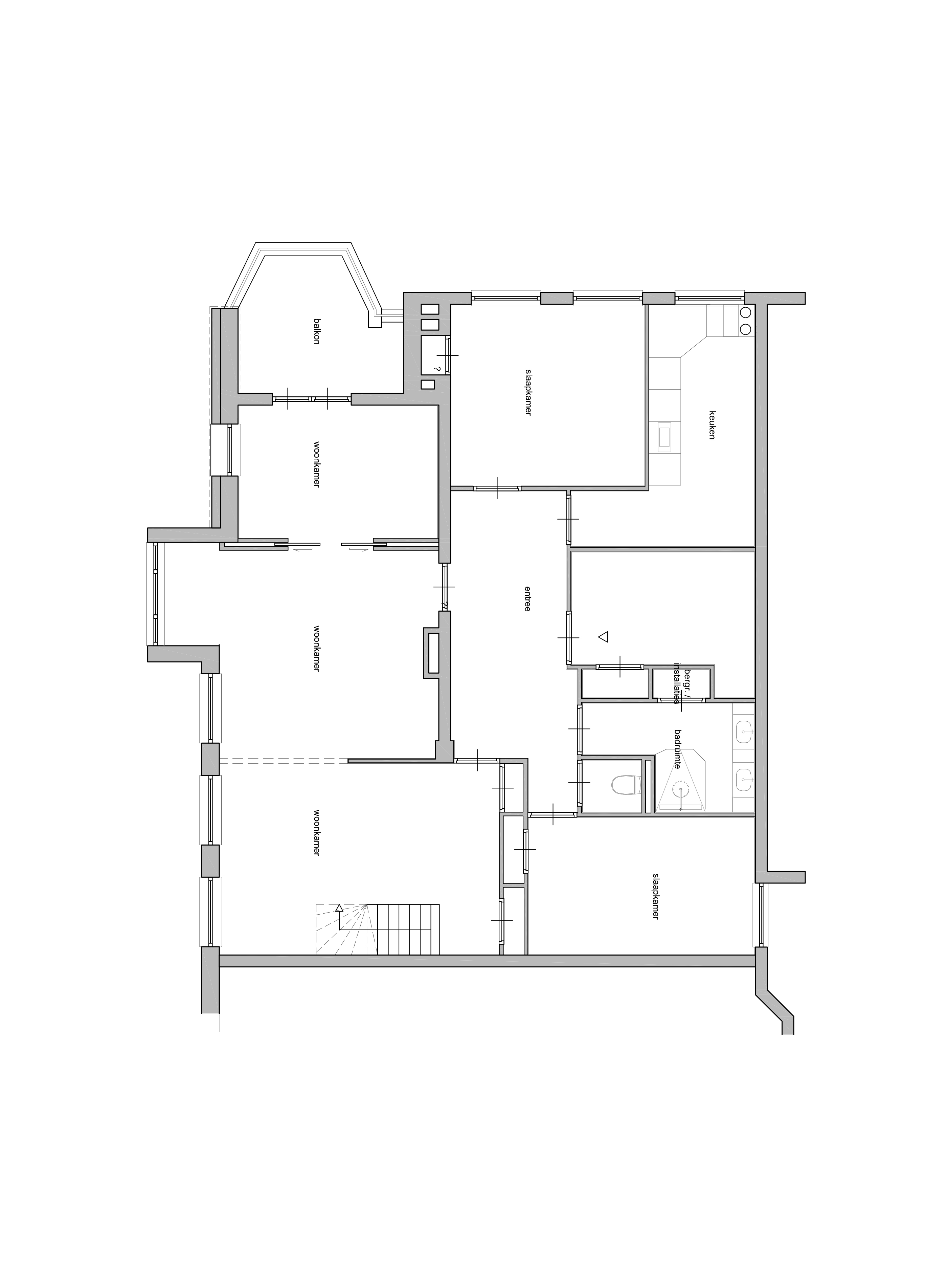 Het oorspronkelijke 2 laags appartement had een 'hokkerige' structuur en de ruimtes waren niet in de gewenste verhouding. Een dragende wand zorgde voor een enorme hal, een kleine weggestopte keuken en nog kleinere inpandige badkamer en toilet.