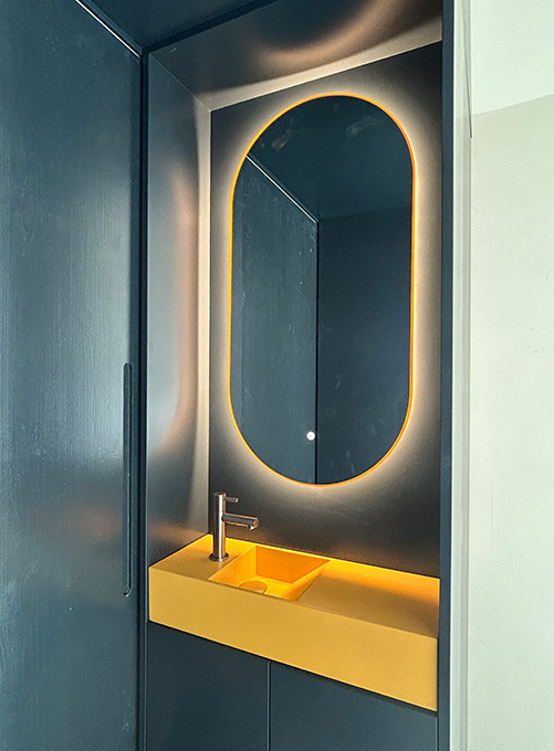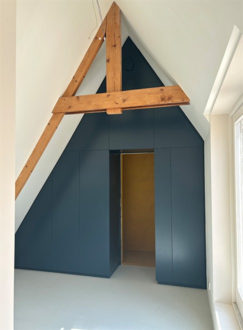 De trap is gespiegeld waardoor een ruime berging onder de trap gemaakt kon worden en een 'zee van licht' van boven naar beneden komt. De buitenwanden zijn voorzien van biobased isolatie met een leemstuc. Voor de hybride installaties (voorbereid op volledig gasloos) is een bergruimte toegevoegd. Dit leverde in de badkamer extra ruimte op en samen met een toegevoegd daklicht voelt de badkamer een stuk ruimer aan. De badkamers en toilet zijn afgewerkt met Mortex (materiaalbesparing) en ontworpen met slimme bergruimte. Het kleurenpallet is afgestemd op meeverhuisde elementen en geeft elke ruimte een eigen sfeer.