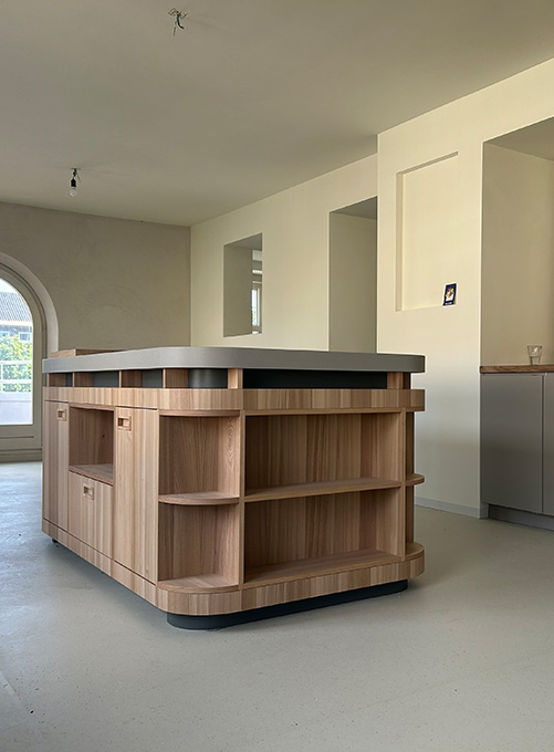 De opdrachtgevers wilden een licht 'loft achtig' appartement met voldoende (berg)ruimte en privacy voor 2 volwassen kinderen. En een plek om samen te koken en muziek te maken.
