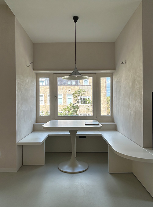 Het appartement is opnieuw ingedeeld als een vloeiende doorlopende ruimte. Met de grote schuifdeuren kunnen de kinderen zich gedeeltelijk of volledig afzonderen. In de dragende wand zijn 2 doorzichten gemaakt voor zicht op de voordeur extra contact.