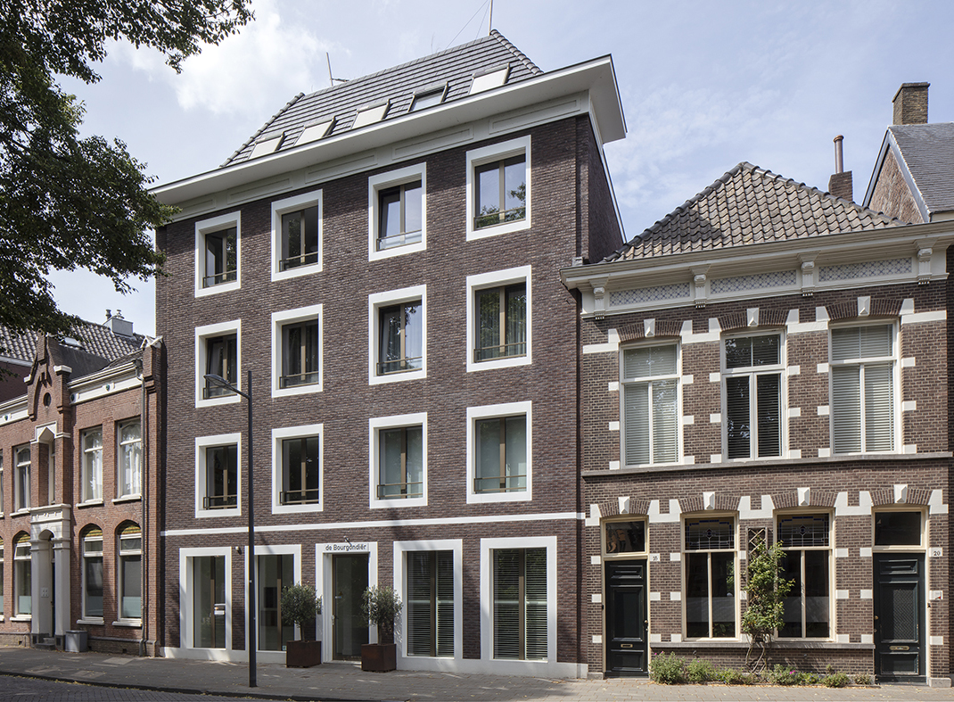 De gevel is uitgevoerd in donker rode baksteen die herinnert aan de kerk en aansluit op de aangrenzende panden. De kap, de kroonlijst en de raamkaders zijn een moderne vertaling van traditionele binnenstedelijke architectuur.