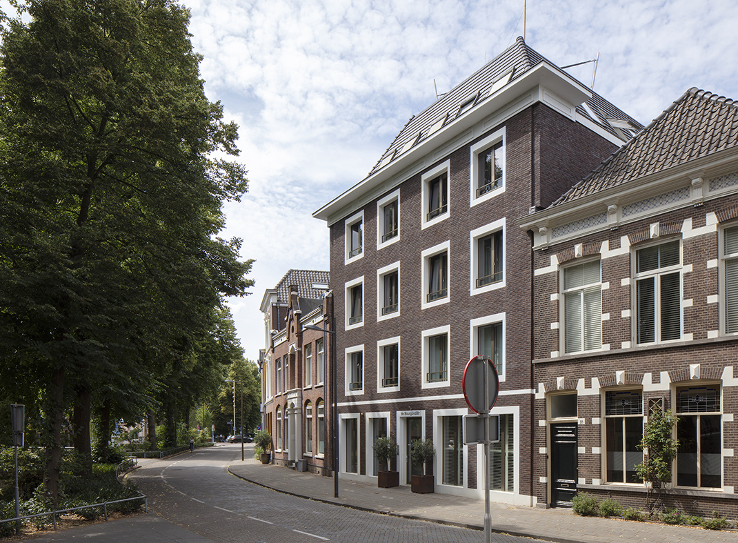 De diepe negges geven extra diepte en schaduwwerking in de gevel en benadrukken de massa van het 'kloeke' appartementengebouw. De plint heeft een iets hogere verdiepingshoogte en sluit aan bij de verticale geleding van de aangrenzende panden. Op de verdieping wijkt de gevel af van deze verticaliteit en worden de ramen meer vierkant als in een '(woon)hotel'. Deze afwijking benadrukt de verbijzondering op de plek van de voormalige kerk.