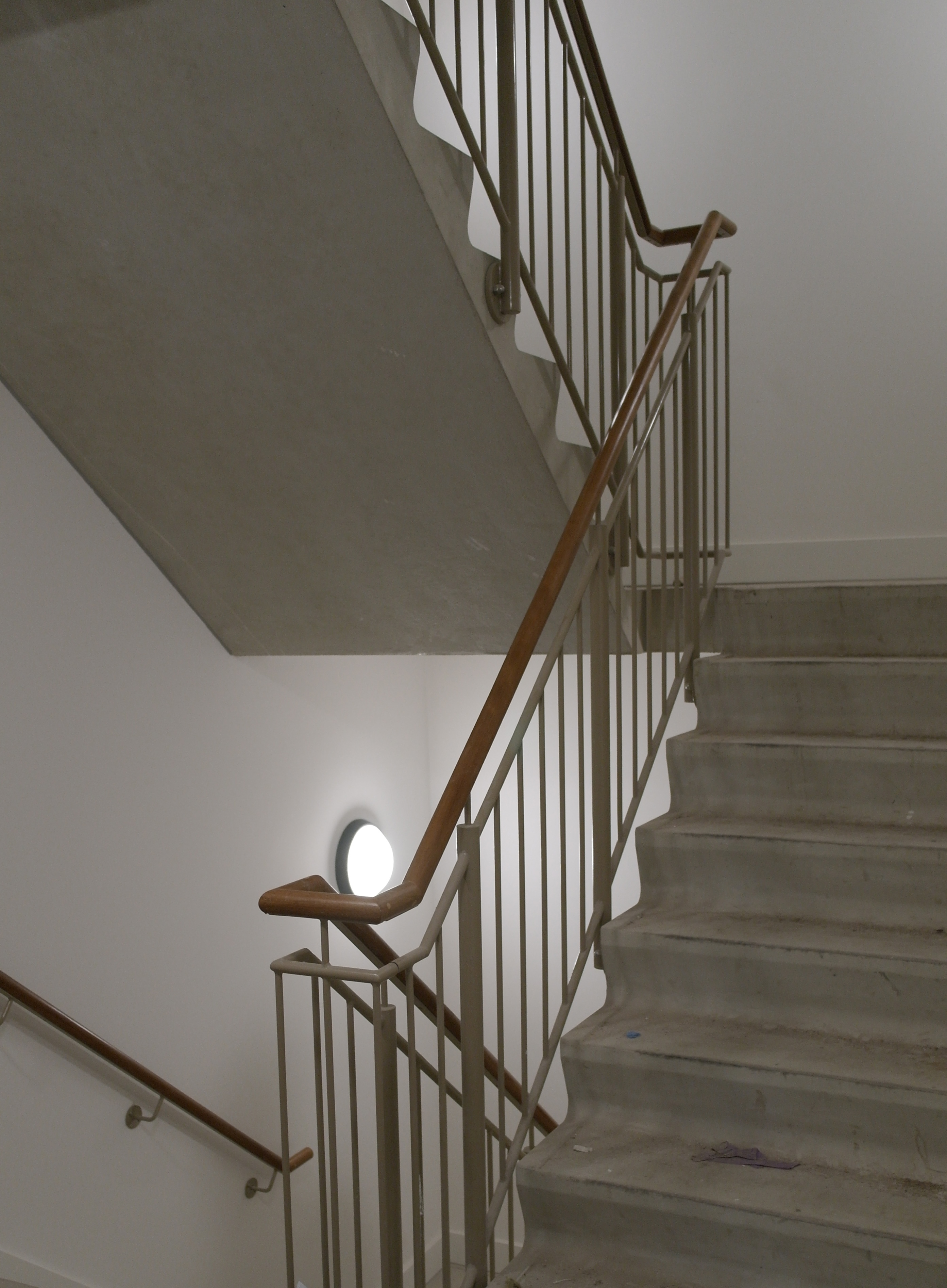 De kenmerkende 'groene ruitjes' zijn hergebruikt in de entreehal en gravures boven de postkasten herinneren aan de historie en de immer veranderende stad.
