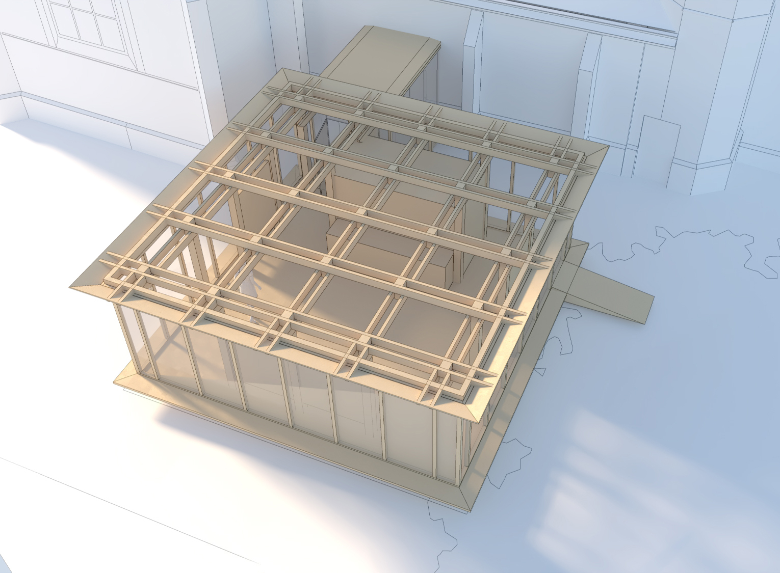 De houten (spant)structuur en kozijnen met transparante en translucente isolatiebeglazing zorgen voor een heldere en demontabele stuctuur.