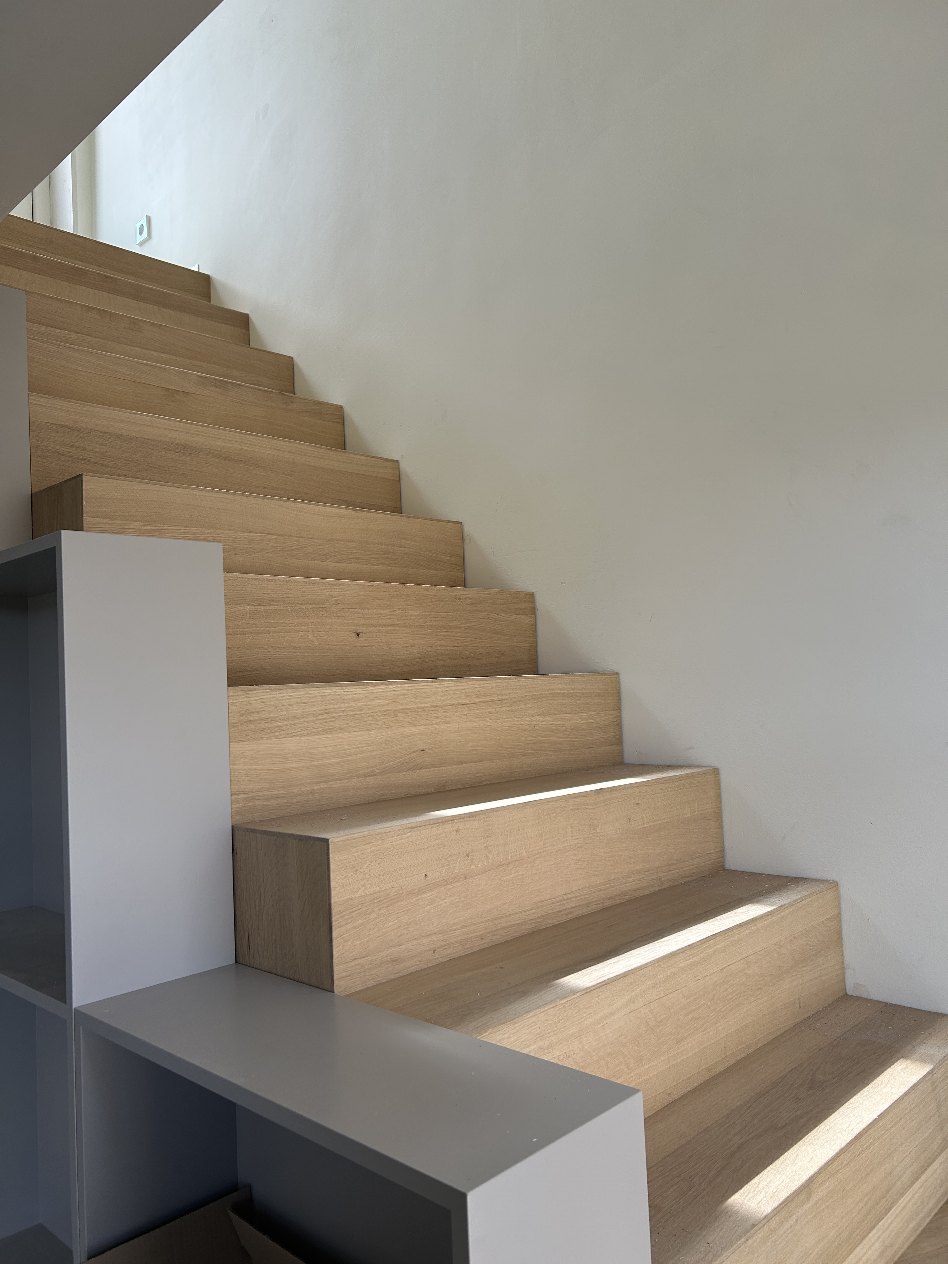 De trap is gespiegeld waardoor een ruime berging onder de trap gemaakt kon worden en een 'zee van licht' van boven naar beneden komt. De buitenwanden zijn voorzien van biobased isolatie met een leemstuc. Voor de hybride installaties (voorbereid op volledig gasloos) is een bergruimte toegevoegd. Dit leverde in de badkamer extra ruimte op en samen met een toegevoegd daklicht voelt de badkamer een stuk ruimer aan. De badkamers en toilet zijn afgewerkt met Mortex (materiaalbesparing) en ontworpen met slimme bergruimte. Het kleurenpallet is afgestemd op meeverhuisde elementen en geeft elke ruimte een eigen sfeer.