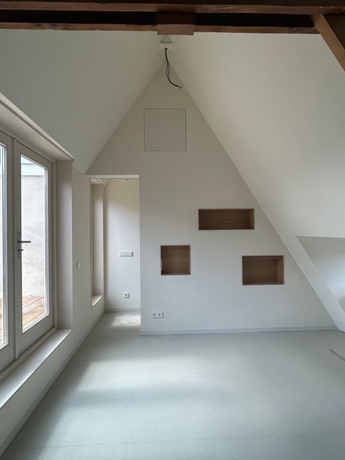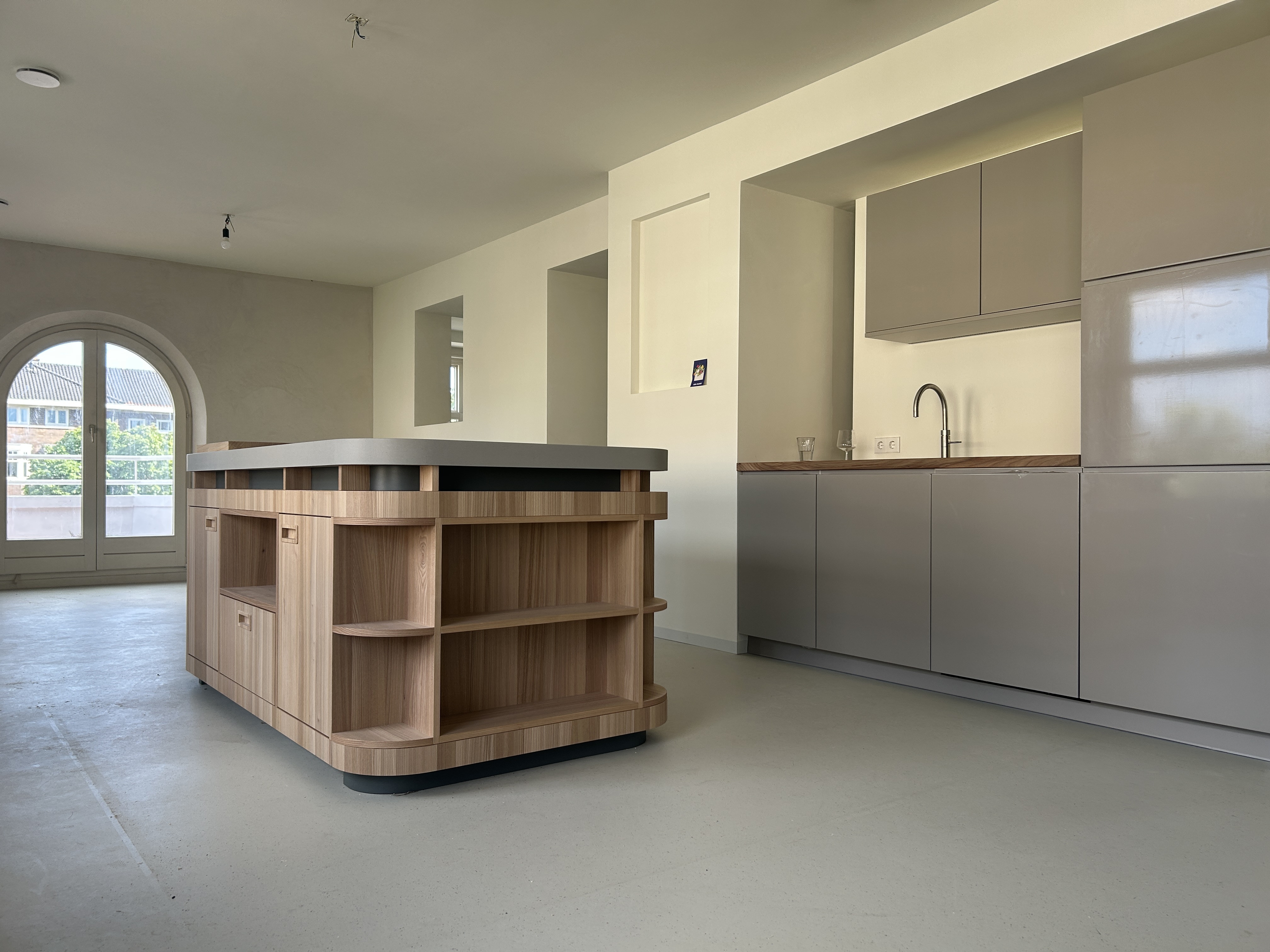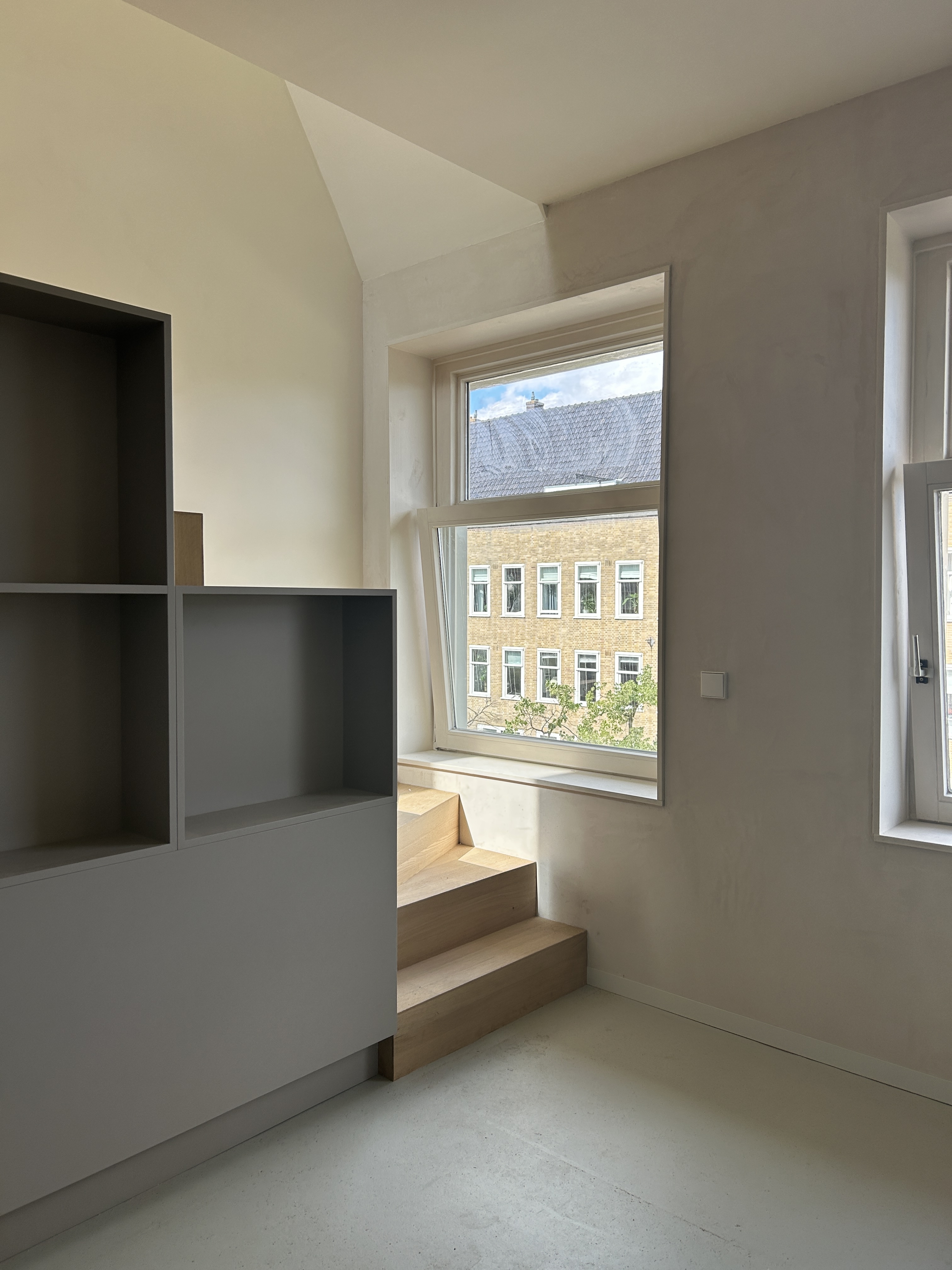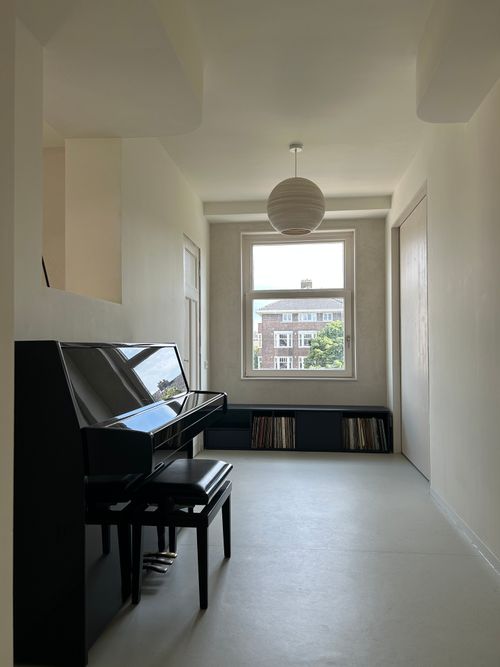 De opdrachtgevers wilden een licht 'loft achtig' appartement met voldoende (berg)ruimte en privacy voor 2 volwassen kinderen. En een plek om samen te koken en muziek te maken.